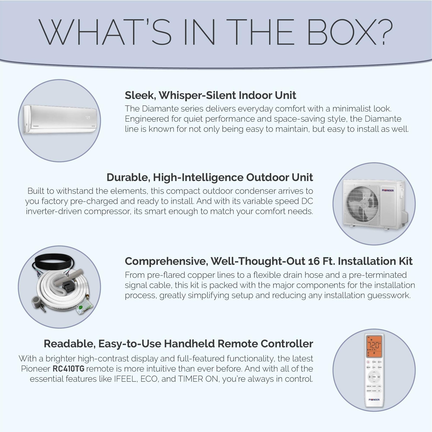 Details: Designed for efficiency, comfort and performance, Pioneer Wall Mounted Ductless Mini Split Systems brings effective heating and cooling to your living space. The ductless design eliminates the use of duct work, making it easier to install the unit in a variety of locations and with minimal modification to your home.